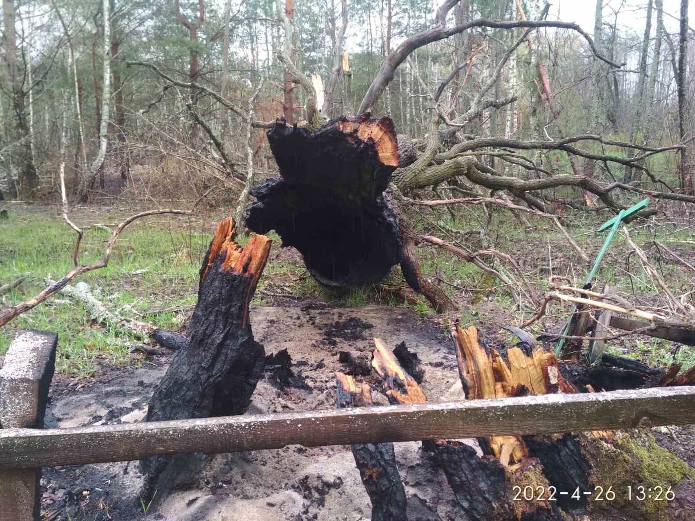 Це величезне дерево висотою понад 25 метрів було огороджене та мало табличку природно-заповідного фонду України. Російські війська здійснювали обстріл території заповідника в селі Звіздаль та цілеспрямовано підпали пам’ятку природи.