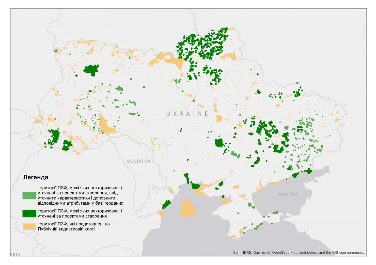 Станом на березень 2023 року створено або уточнено межі 1 851 об’єкта ПЗФ у межах 17 областей України. Для цього фахівці зібрали, опрацювали та впорядкували 6 837 схем та 113 629 інших установчих документів ПЗФ.