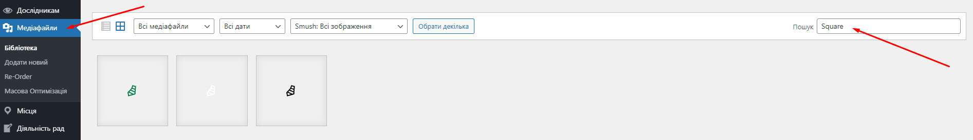 Щоб знайти іконку в Медіа бібліотеці потрібно скопіювати назву і використати пошук.
