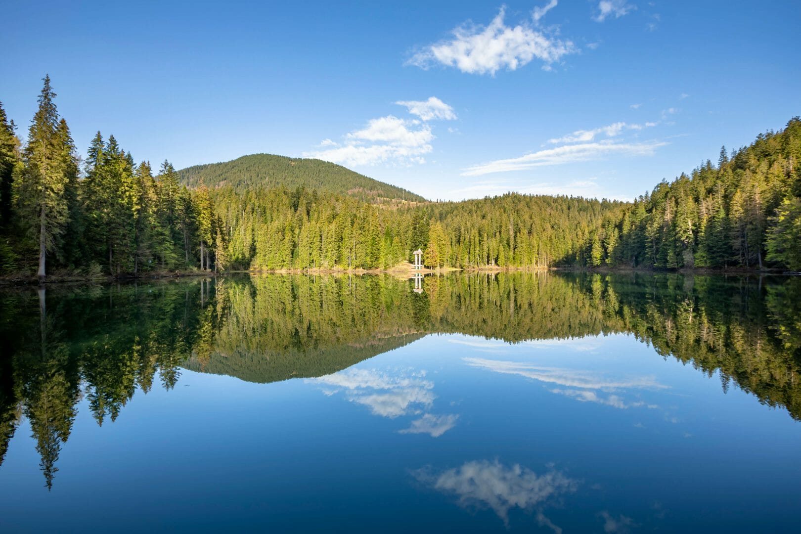 Озеро Синевир. Екостежка до озера починається тут: 48.615145, 23.699589 Десять тисяч років тому внаслідок землетрусу утворилося найбільше озеро українських Карпат природного походження — Синевир. Воно є одним із семи природних чудес України та водно-болотним угіддям міжнародного значення — це цінне середовище існування водоплавних птахів. Розкинулося між горами, серед смереково-ялинового лісу на висоті 989 метрів над рівнем моря, поблизу села Синевирська Поляна. Лиш уявіть: стрімкі схили довкола озера вкриті ялинами, вік яких сягає 140–160 років, а посередині водної гладі, немов зіниця блакитного ока, лежить невеликий острівець. Тому озеро Синевир ще називають Морським оком. Середня глибина озера сягає 8–10 метрів, найглибша його точка — 23,5 метра. Вода тут максимально нагрівається лише до 13 °С. Зауважте, що купатися, рибалити в озері не можна.